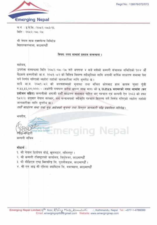 काठमाडौं । इमर्जिङ्ग नेपाल लिमिटेडको मंसिर २८ गते बसेको सञ्चालक समितिको बैठकले नगद लाभांश घोषणा गरेको छ।बैठकले गत आर्थिक वर्षको मुनाफा तथा संचित कोषबाट हाल कायम चुक्ता पूँजी ५५ करोड ५६ लाख रुपैयाँको ५.२६३१५ प्रतिशत नगद लाभांश (कर प्रयोजन सहित) वितरणको निर्णय गरेको हो।
