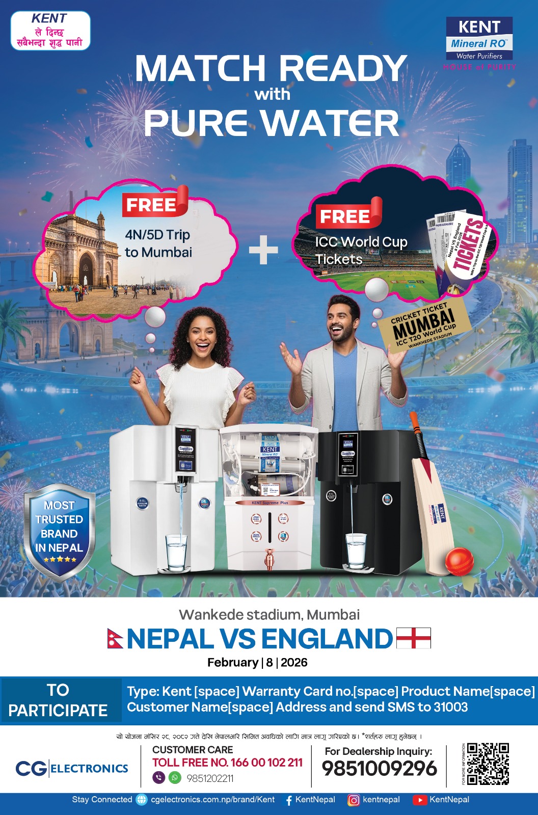 यस योजनाअन्तर्गत केन्टका छनोट गरिएका वाटर प्युरिफायर खरिद गर्ने भाग्यशाली ग्राहकहरूले ८ फेब्रअरी, २०२६ मा मुम्बईको वानखेड़े स्टेडियममा आयोजना हुने नेपाल बिरुद्ध इंग्ल्याण्डको आईसीसी टी–२० विश्वकप खेलको टिकट निःशुल्क प्राप्त गर्न सक्नेछन्। साथै, भाग्यशाली विजेताले ४ रात र ५ दिनको मुम्बई भ्रमण प्याकेज समेत जित्ने अवसर पाउनेछन्।