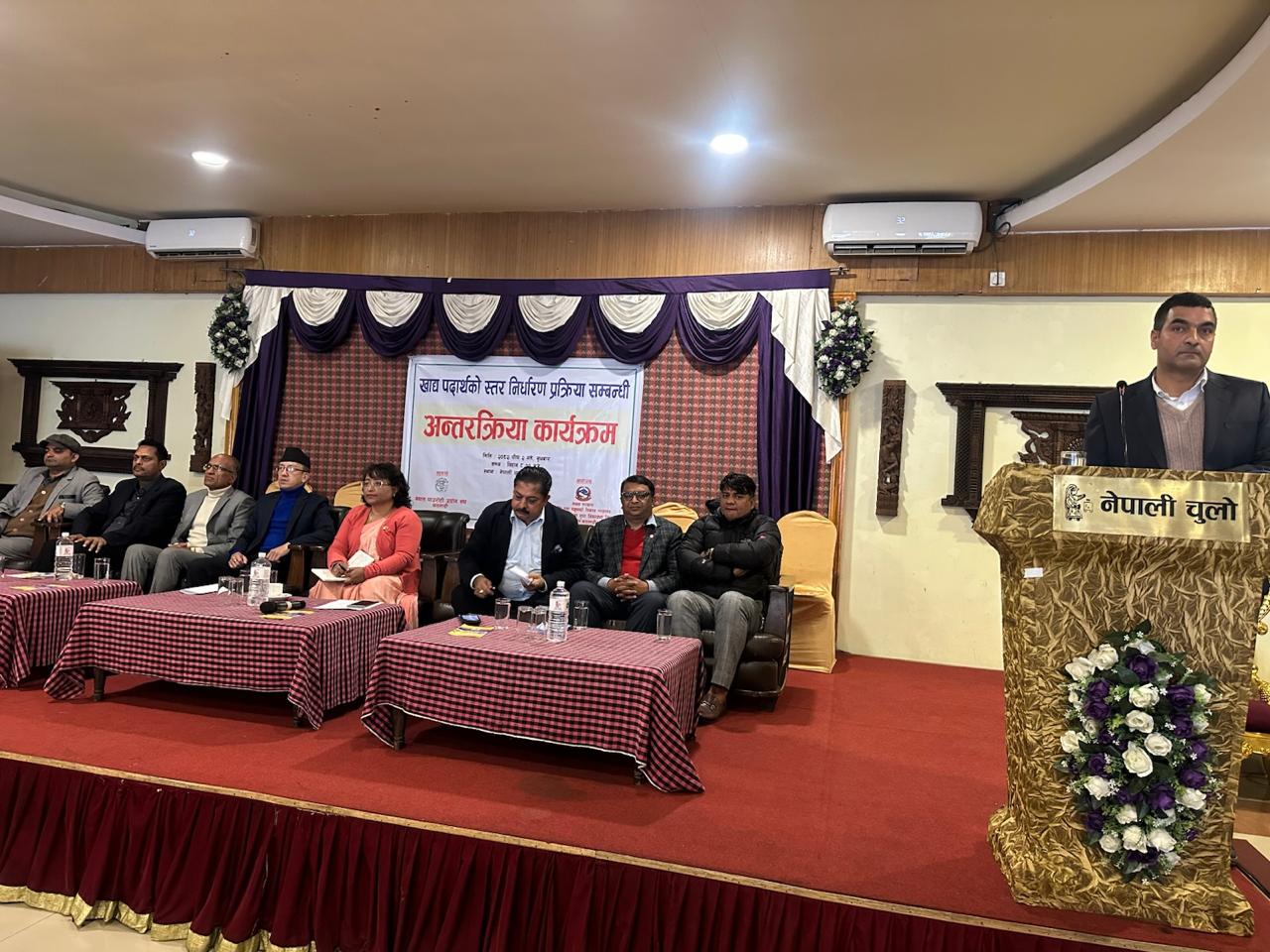 काठमाडौं। खाद्य प्रविधि तथा गुण नियन्त्रण विभाग, बबरमहलको आयोजना तथा नेपाल पाउरोटी उद्योग संघ, काठमाडौँको सहकार्यमा खाद्य पदार्थको स्तर निर्धारण प्रक्रिया सम्बन्धी अन्तरक्रिया कार्यक्रम सम्पन्न भएको छ। पुस २ गते काठमाडौंको लाजिम्पाटस्थित नेपाली चुलो भोजनालयमा आयोजित उक्त कार्यक्रममा बेकरी उद्योगी व्यवसायी, नेपाल उद्योग वाणिज्य महासंघका पदाधिकारी तथा विभिन्न सरोकारवालाहरूको सहभागिता रहेको थियो।