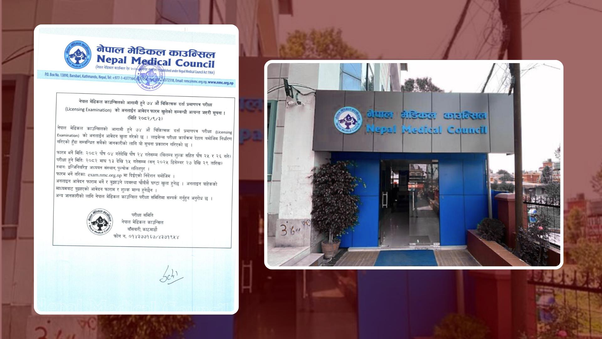 काठमाडौं । नेपाल मेडिकल काउन्सिलले चिकित्सक दर्ता प्रमाणपत्र परिक्षाको अनलाईन आवेदन खुला गरेको छ । काउन्सिलले बिहीबार सावर्जनिक सुचना जारी गर्दै ७४ औं चिकित्सक दर्ता प्रमाणपत्र परीक्षाका लागि आवेदन खुलाएको हो ।