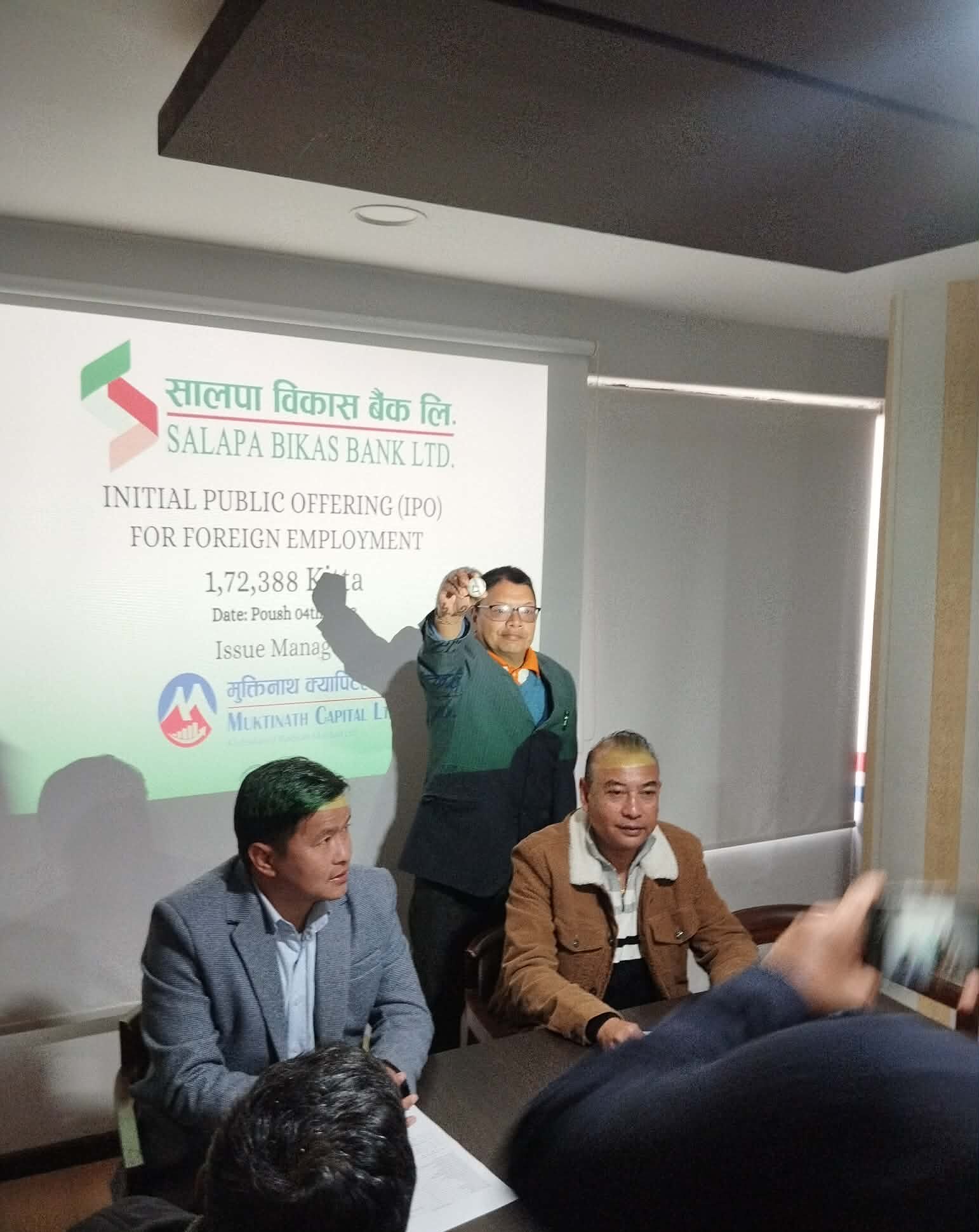 काठमाडौं । सालपा विकास बैंक लिमिटेडले वैदेशिक रोजगारीमा रहेका नेपालीहरुका लागि निष्काशन गरेको आईपीओ बाँडफाँट गरेको छ। बैंकले गत मंसिर २९ गतेदेखि पुस २ गतेसम्म नेपाल सरकारको सम्बन्धित निकायबाट श्रम स्वीकृति प्राप्त गरी विदेशमा रोजगारी गरिरहेका नेपालीहरुका लागि प्रतिशेयर १०० रुपैयाँ अंकित मूल्यका १ लाख ७२ हजार ३८८ कित्ता शेयर निष्काशन गरेको थियो।
