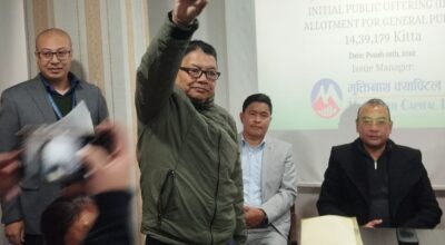काठमाडौं । बिहीबार शेयर बजार सामान्य बढेर बन्द भएको छ। आज नेप्से परिसूचक ४.५९ अंकले बढेर २६४०.५४ को विन्दुमा कायम भएको हो। आज सेन्सेटिभ इण्डेक्स ०.९२ अंक बढेको छ भने फ्लोट इण्डेक्स ०.४५ अंक र सेन्सेटिभ फ्लोट इण्डेक्स ०.३५ अंक बढेको छ।