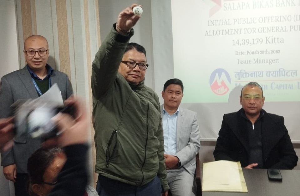 काठमाडौं । सालपा विकास बैंकको आइपीओ आज पुस २५ गते बाँडफाँट गरिएको छ। धितोपत्र बिक्री प्रबन्धक मुक्तिनाथ क्यापिटलमा सालपा विकास बैंकको आइपीओ बाँडफाँट गरिएको हो। आइपीओ बाँडफाँट कार्यक्रम बिहान साढे ९ बजे राखिएको हो।