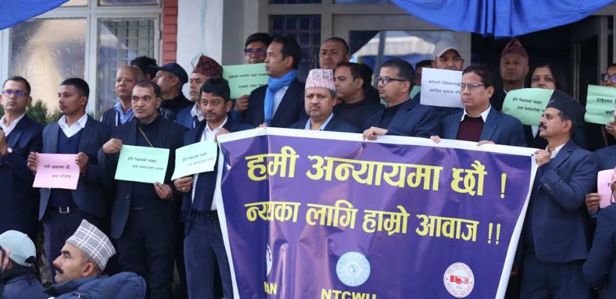 सङ्गठनहरूले ‘हामी अन्यायमा छौँ, न्यायका लागि हाम्रो आवाज’ लेखिएको व्यानर बोकेका थिए। त्यस्तै, उनीहरूले आवधिक बढुवा, कर्मचारी विनियमावलीको संशोधन, सेवा सुविधा सुनिश्चित गर्नुपर्ने लगायतका माग राखेका थिए।