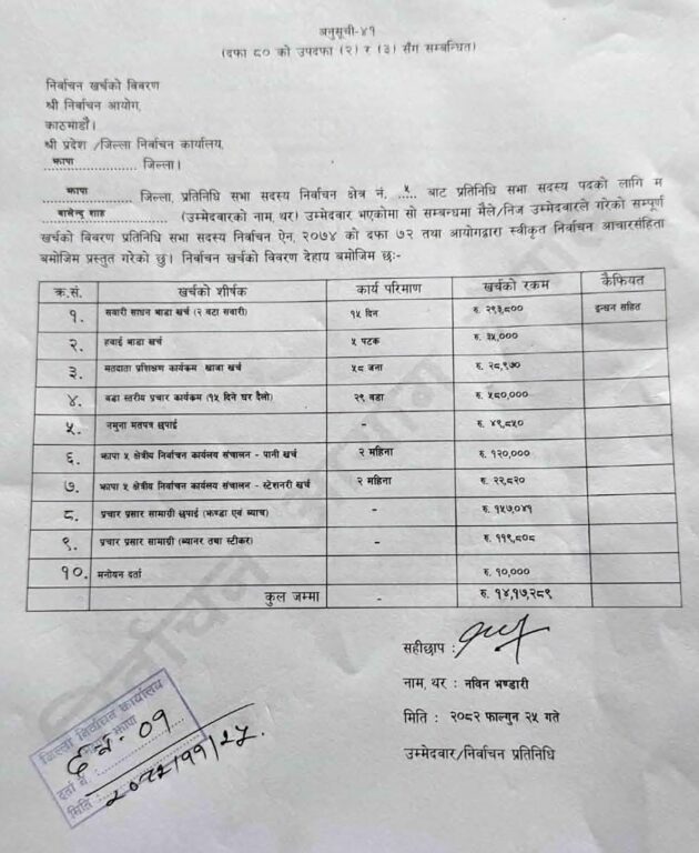 यसैगरी बालेनले निर्वाचन कार्यालय सञ्चालनमा २ महिनाको पानी खर्च १ लाख २० हजार, स्टेसनरीमा २२ हजार ८२० रुपैयाँ, झन्डा र ब्याचसहितको प्रचारप्रसार सामग्री छपाइमा १ लाख ५७ हजार ४१ रुपैयाँ, ब्यानर तथा स्टिकरमा १ लाख १९ हजार ८०८ रुपैयाँ र मनोनयन दर्तामा १० हजार रुपैयाँ खर्च गरेका छन्।