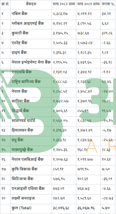 काठमाडौँ । चालु आर्थिक वर्षको माघ मसान्तसम्ममा सञ्चालनमा रहेका २० वटा वाणिज्य बैंकहरूले कुल ३८ अर्ब १ करोड ६६ लाख रुपैयाँ खुद नाफा आर्जन गरेका छन्। नेपाल राष्ट्र बैंकले सार्वजनिक गरेको तथ्यांकअनुसार यो गत वर्षको सोही अवधिको तुलनामा ५.४० प्रतिशतले बढी हो। गत वर्ष माघ मसान्तसम्म बैंकहरूले कुल ३६ अर्ब ६ करोड ७९ लाख रुपैयाँ नाफा कमाएका थिए।