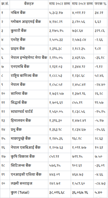 तथ्याङ्कअनुसार खुद नाफा आर्जनमा नबिल बैंकले आफ्नो अग्रता कायम राखेको छ। नबिल बैंकले समीक्षा अवधिमा ५ अर्ब ३८ करोड ३१ लाख रुपैयाँ नाफा कमाएको छ । जुन गत वर्षको तुलनामा ३४.२१ प्रतिशतले बढी हो। त्यसैगरी, ग्लोबल आइएमई बैंक ४ अर्ब १४ करोड ८२ लाख रुपैयाँ नाफासहित दोस्रो स्थानमा रहेको छ।