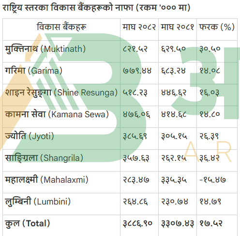 तथ्यांकअनुसार राष्ट्रियस्तरका ८ वटा विकास बैंकहरुले चालु आर्थिक वर्षको माघसम्म कुल ३ अर्ब ८८ करोड ६९ लाख रुपैयाँ नाफा आर्जन गरेको छन। अघिल्लो आर्थिक वर्ष २०८१/८२ को यही अवधिसम्म यी बैंकहरुले ३ अर्ब ३० करोड ७४ लाख रुपैयाँ मात्रै नाफा आर्जन गरेका थिए।