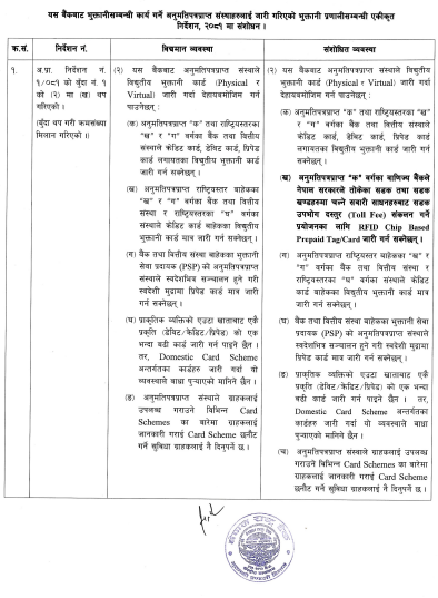 राष्ट्र बैंकले भुक्तानी प्रणालीसम्बन्धी एकीकृत निर्देशन, २०८१ मा संशोधन गर्दै वाणिज्य बैंकहरूलाई मात्रै सडक उपभोग दस्तुर संकलनका लागि विशेष कार्ड जारी गर्ने बाटो खोलेको छ।