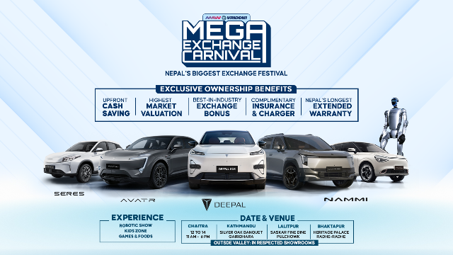 एमएडब्लु वृद्धिले आफ्नो लोकप्रिय इभी ब्रान्डहरु दिपल, अवतार, नामी र सेरेसलाई एउटै प्लेटफर्ममा समेटेर मेगा एक्सचेन्ज कार्निभल आयोजना गर्ने तयारी गरेको छ । आगामी चैत १२ गतेदेखि १४ गतेसम्म देशैभरि आयोजना हुने मेगा एक्सचेन्ज कार्निभल डिजाइन र प्रविधिमा अब्बल इभीमा अपग्रेड हुने सबैभन्दा उत्तम समय रहेको बताइएको छ ।