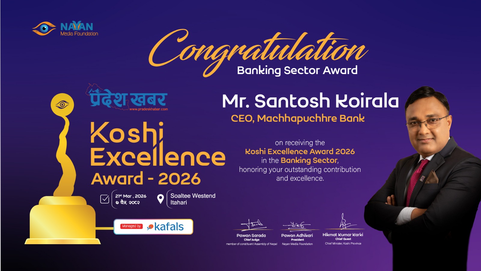 नयन मिडिया फाउन्डेसन इटहरीले आयोजना गरेको ‘कोशी एक्सिलेन्स अवार्ड २०२६’ समारोहमा बैंकिङ विधातर्फको अवार्ड माछापुच्छ्रे बैंकका प्रमुख कार्यकारी अधिकृत कोइरालालाई प्रदान गरिएको हो ।