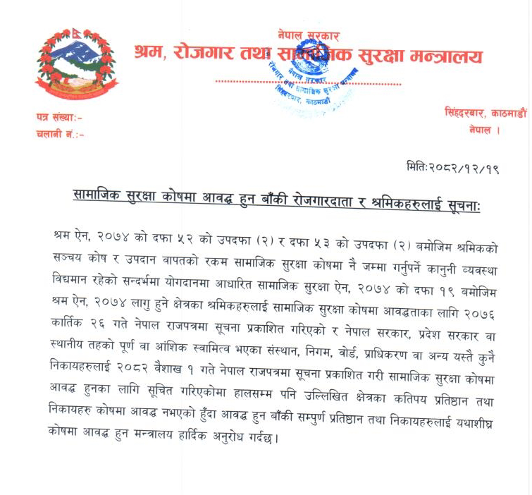 तर हालसम्म पनि कतिपय प्रतिष्ठान तथा निकायहरू सामाजिक सुरक्षा कोषमा आबद्ध नभएको पाइएकाले बाँकी सबै रोजगारदाता तथा श्रमिकहरूलाई तत्काल कोषमा आबद्ध हुन मन्त्रालयले आग्रह गरेको छ।
