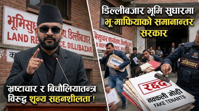 काठमाडौँ । मुलुकमा प्रधानमन्त्री बालेन शाह नेतृत्वको नयाँ सरकारले भ्रष्टाचार र बिचौलियातन्त्र विरुद्ध ‘शून्य सहनशीलता’ को नीति अघि सारिरहेको दाबी गरिरहँदा, डिल्लीबजारस्थित भूमि सुधार कार्यालय भने अझै पनि बिचौलिया र भ्रष्ट कर्मचारीको अभेद्य किल्ला बनिरहेको छ।
