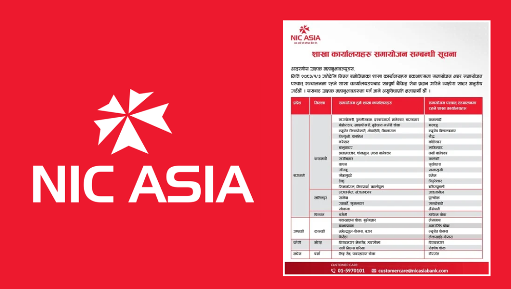 काठमाडौं । एनआईसी एशिया बैंकले देशभर आफ्ना विभिन्न ४२ वटा शाखा कार्यालयहरू समायोजन (मर्ज) गर्ने निर्णय गरेको छ । बैंकले जारी गरेको सूचनाअनुसार आजदेखि विभिन्न स्थानमा रहेका शाखाहरू एकआपसमा गाभिएर सेवा दिनेछन् ।