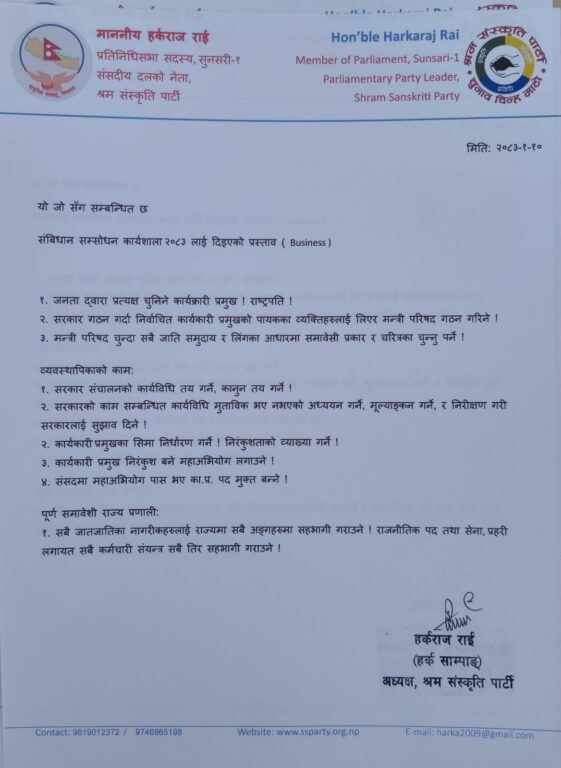 काठमाडौं । श्रम संस्कृति पार्टीका अध्यक्ष हर्क साम्पाङ राईले संविधान संशोधनसम्बन्धी विस्तृत प्रस्ताव सार्वजनिक गरेका छन् । उनले ‘संविधान संशोधन कार्यशाला २०८३’ जारी गर्दै प्रत्यक्ष निर्वाचित कार्यकारी राष्ट्रपतीय प्रणालीको पक्षमा आफ्नो प्रस्ताव अघि सारेका हुन् ।