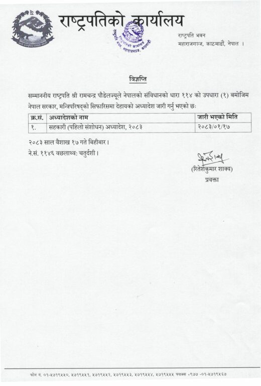 सरकारको सिफारिसका आधारमा राष्ट्रपति पौडेलले अध्यादेश जारी गरेको राष्ट्रपति कार्यालयका प्रवक्ता रितेशकुमार शाक्यले जानकारी दिएका छन्।