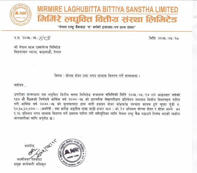 काठमाडौं । मिर्मिरे लघुवित्त वित्तीय संस्था लिमिटेडले लाभांश दिने भएकाे छ । लघुवित्तले २४ प्रतिशत बोनस र १ दशमलव २६ प्रतिशत नगद लाभांश दिने भएको छ ।
