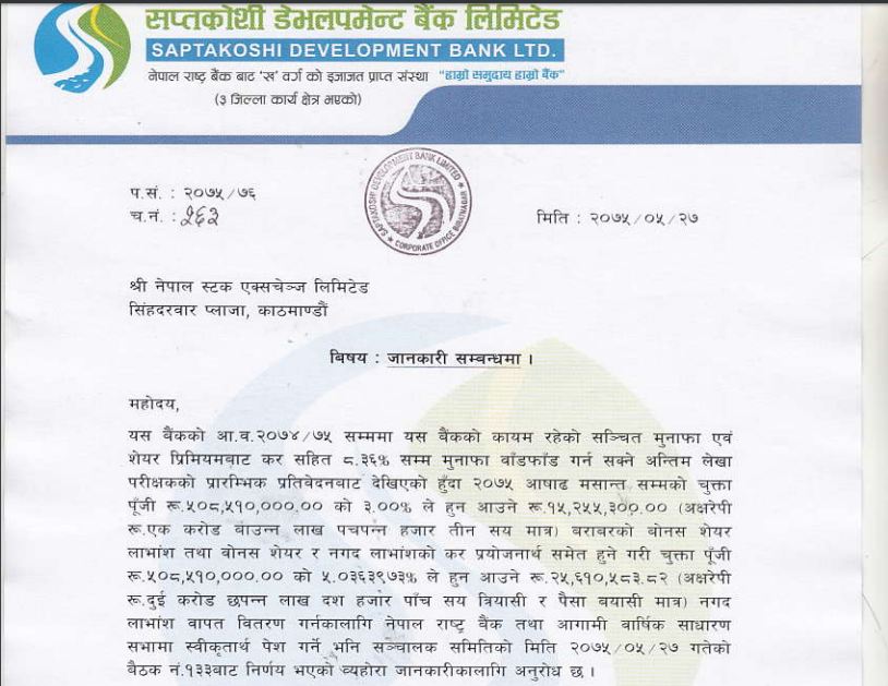 सप्तकोशी डेभलपमेन्ट बैंकले  ८.०३६% लाभांश दिने « Devoted for Economic Devlopment, आर्थिक विकासको लागि समर्पित