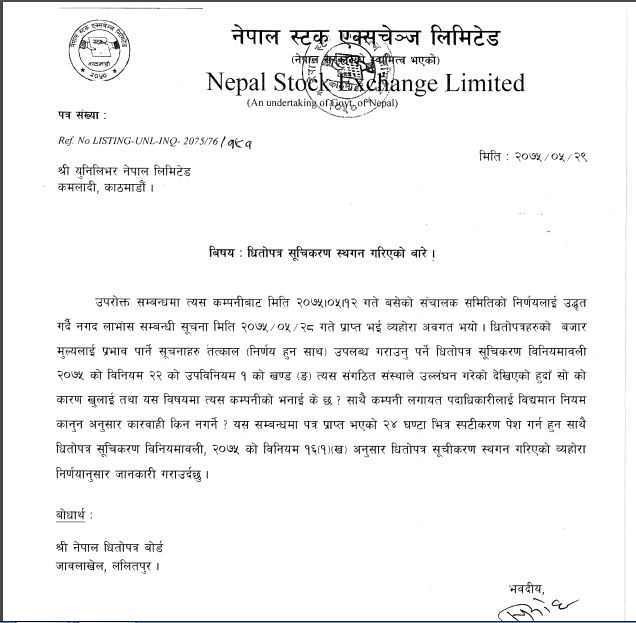 धिताेपत्रहरुकाे बजार मुल्यलार्इ पभाव पार्ने सुचनाहरु तत्काल उपलब्ध गराउनु पर्ने धिताेपत्र सुचिकरण विनियमावली २०७५ काे विनियम २२काे उपविनियम १ काे खण्ड (ङ) बमोजिम युनिलिभरले नियम उल्लंघन गरेकाले त्यसको कारण खुलाएर जवाफ पेश गर्न नेप्सेले निर्देशन दिएको छ। युनिलिभरको भदौ १२ गते सम्पन्न सञ्चालक समितिको बैठकले गत आर्थिक बर्षको नाफाबाट सेयरधनीलाई ७०० प्रतिशत नगद लाभांश वितरण गर्ने प्रस्ताव गरेकाे थियाे जुन सूचना युनिलिभरले भदौ २८ गतेमात्र नेप्सेमा जानकारी गराएको थियो ।