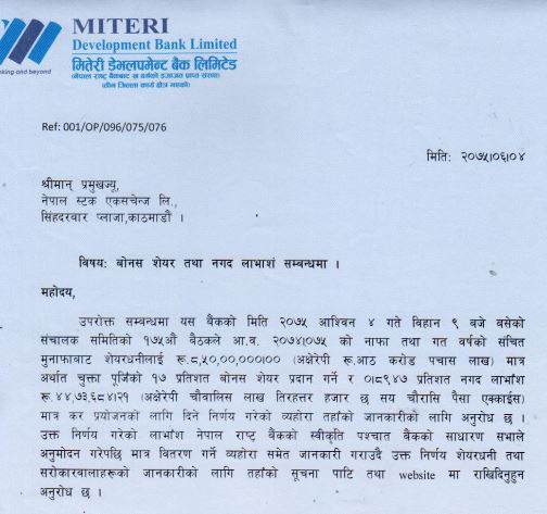मितेरी डेभलपमेन्ट बैंकले  लाभांश दिने