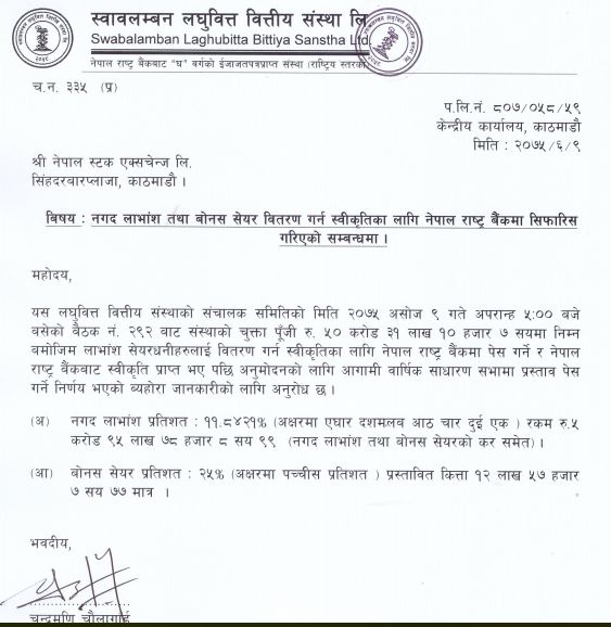 काठमाडौं । स्वावलम्बन लघुवित्त वित्तीय संस्थाले ३६.८४% लाभांश दिने भएको छ ।  कम्पनीको असाेज ९ गते  बसेको सञ्चालक समितिकाे  बैठकले २५% बोनस सेयर र ११.८४% नगद लाभांश वितरण गर्ने निर्णय गरेको हो । साे लाभाासं लगानीकर्ताल भने  राष्ट्र बैंक र आगामी वार्षिक साधारण सभाले पारित  गरेपछि मात्र पाउने छन्  ।