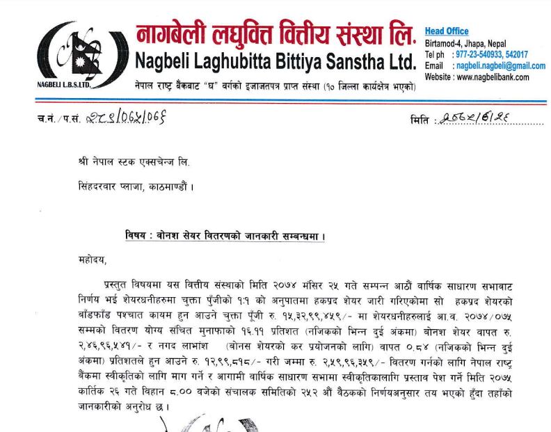 नागबेलीले २ करोड ४६ लाख ९६ हजार ५४१ रुपैयाँ बोनसमा र १२ लाख ९९ हजार ८१८ रुपैयाँ नगद लाभांशमा खर्च गर्न लागेकाे छ ।