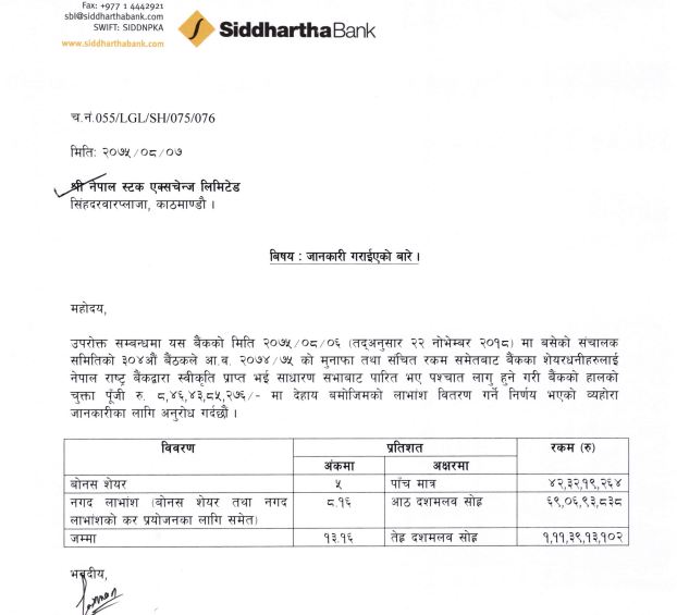 काठमाडौं। सिद्धार्थ बैंक लिमिटेडले बोनस सेयर र नगद लाभांश दिने भएको छ । बैंकको मंसिर ६ गते ( बिहीबार) बसेको संचालक समितिको बैठकबाट शेयरधनीहरुलाई नाफाबाट ५ प्रतिशत बोनस सेयर र ८ दशमलव १६ प्रतिशत नगद गरी कुल १३.१६ प्रतिशत लाभांश वितरण गर्ने प्रस्ताव गरेको छ ।