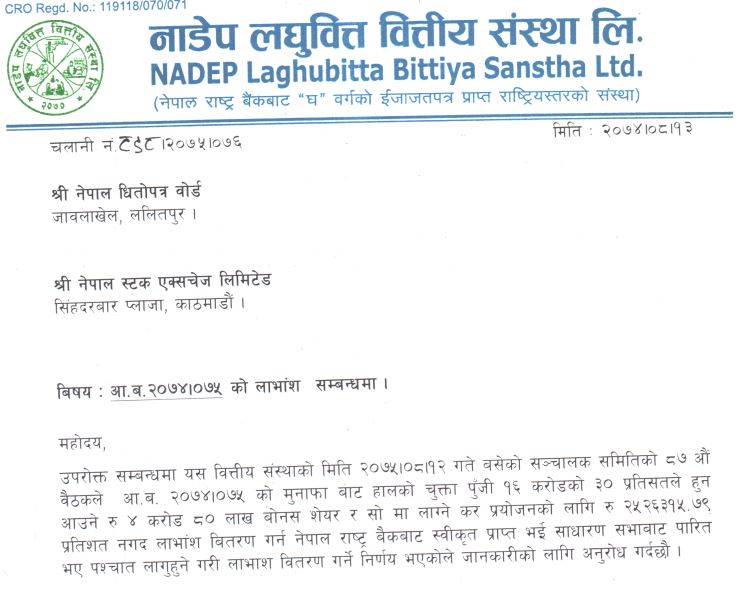 नाडेप लघुवित्तले  बाेनस र नगद लाभांश दिने