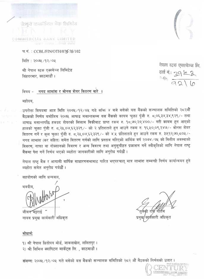 काठमाडौं / सेन्चुरी कमर्सियल बैंक लिमिटेडले गत आर्थिक वर्षको मुनाफाबाट आफ्ना शेयर धनीलाई बोनस दिने घोषणा गरेको छ ।यही चैत ५ गते बसेको संचालक समितिको बैठकले २ प्रतिशत बोनस शेयर र ४.५ प्रतिशत नगद लाभांश (कर सहित) दिने निर्णय गरेको हो ।उक्त प्रस्तावित बोनस नेपाल राष्ट्र बैंकबाट स्वीकृत भई बैंकको आगामि हुने वार्षिक साधारणसभाबाट पारित भएपछि शेयरधनीले पाउनेछन् ।