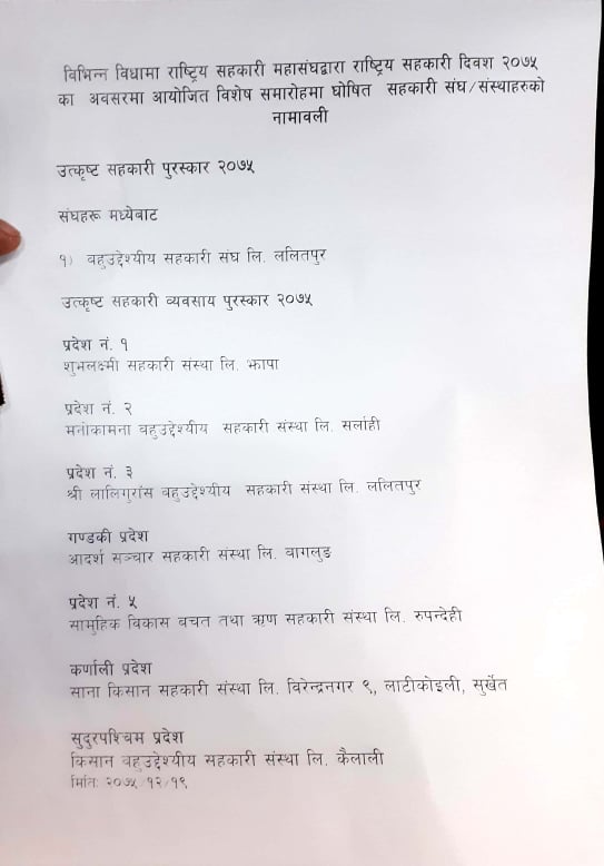 उत्कृष्ठ सहकारी पुरस्कारमा पहुँचवालाकै बाेलवाला, पुरस्कार छनाेट समितिका संयाेजक भन्डारीको संस्था सिफारिसमा « Devoted for Economic Devlopment, आर्थिक विकासको लागि समर्पित