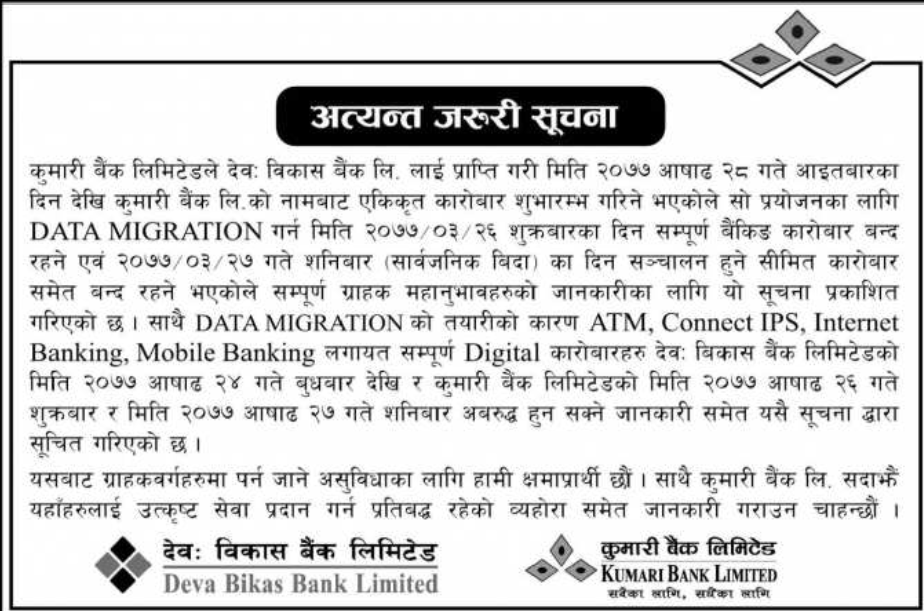 कुमारी बैंकले देवः विकास बैंकलाई १ः०.८६ सेयर स्वाप रेसियोमा प्राप्ति गरेको हो। एकीकृत पछि कुमारी बैंकको नामबाट सेयर कारोबार हुने छ ।