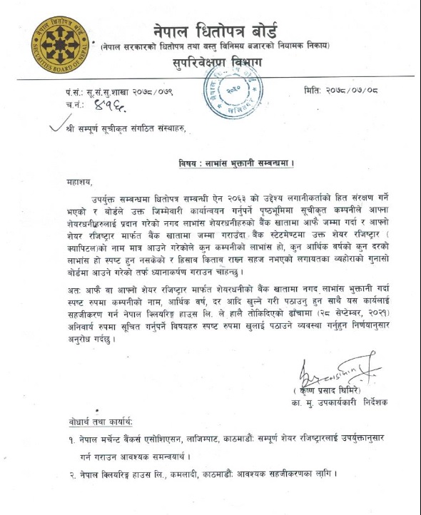 साथै, यस कार्यलाई सहजीकरण गर्न नेपाल क्लियरिङ्ग हाउसले हालै तोकिदिएको ढाँचामा (२८ सेप्टेम्बर, २०२१) अनिवार्य रूपमा सूचित गर्नुपर्ने विषयहरू स्पष्ट रूपमा खुलाई पठाउने व्यवस्था गर्न बोर्डले सम्बन्धित सूचीकृत कम्पनीहरूलाई जानकारी गराएको छ ।