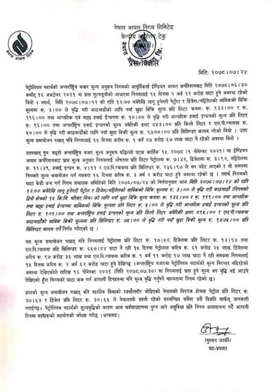 बढेको मूल्य आज मध्यरातदेखि लागि हुनेछ । यसअघि निगमले गत कात्तिक १२ गते पनि डिजेल, पेट्रोल र मट्टितेलको मूल्य बढाएको थियो ।