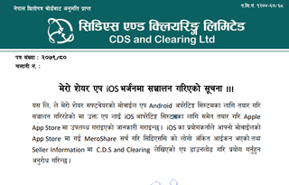 काठमाडौं । मेरो शेयरको एप्लिकेशनलाई सिडिएस एण्ड क्लियरिङ लिमिटेड (सीडीएससी) ले ‘मेरो सेयर’ एप आईओएसबाट प्रयोग गर्न मिल्ने बनाएको छ ।