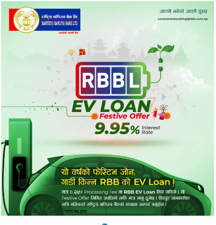 काठमाडौं । राष्ट्रिय वाणिज्य बैंकले विद्युतीय सवारी साधन खरीद गर्न चाहनेलाई एकल ब्याजदरमै कर्जा उपलब्ध गराउने भएको छ । यस बैंकले दशैंतिहार जस्ता ठूला चाडपर्वलक्षित प्रोडक्ट लञ्च गर्दै यस्तो स्किम सार्वजनिक गरेको हो । बैंकले ‘यो वर्षको फेस्टिभ जोन, आरबीबीको इभी लोन’ भन्ने नाराको साथ स्किम सार्वजनिक गरेको हो ।