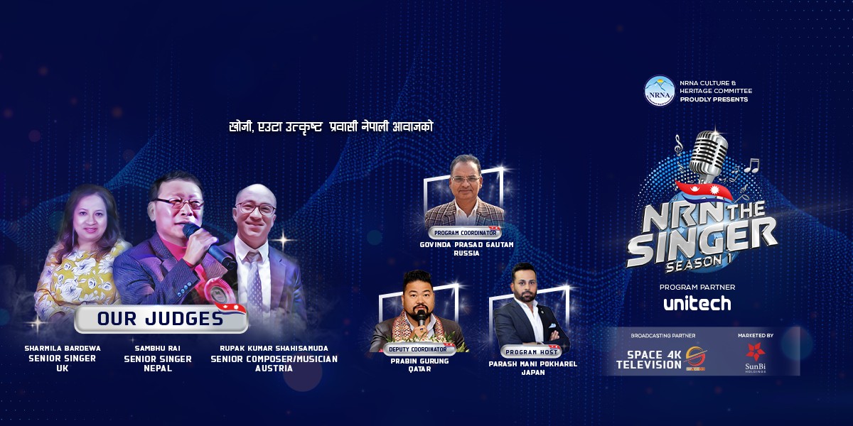 काठमाडौं । ‘खोजी एउटा उत्कृष्ट प्रवासी नेपाली आवाज’ को मूल मन्त्रका साथ ‘एनआरएन द सिङगर’ मंगलबारदेखि प्रसारण हुने भएको छ । गैरआवासीय नेपाली संघ (एनआरएनए)को संस्कृति तथा सम्पदा समितिको संयोजन र युनिटेक नेपालले व्यवस्थापनमा उत्पादन गरिएको कार्यक्रम मंगलबार राति १० बजेदेखि ‘स्पेस फोर के टेलिभिजन’ मा प्रसारण हुनेछ ।
