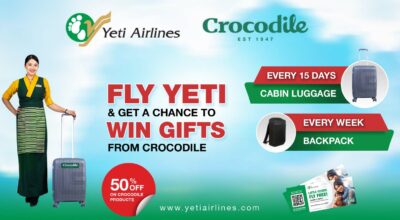 यती एअरलाइन्समा उडान भर्दा क्रोकोडाईल लगेज तथा ब्यागप्याक उपहारमा पाईने