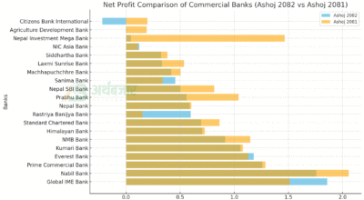 पहिलो त्रैमाससम्म वाणिज्य बैंकहरुको नाफा घट्यो, पाँच वाणिज्य बैंक मात्र अर्ब क्लबमा