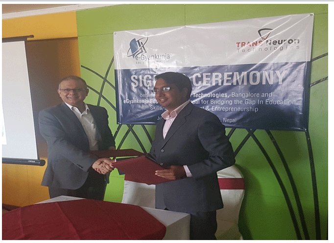 काठमाडौ, १० साउन । ई-ज्ञानकुञ्ज एडु सिस्टम्स प्रा. लि. ले भारतको ट्रान्स न्यूरोन टेक्नोलोजिज संग सहकार्य गरी नेपालमै पहिलो पटक अनलाईन लर्निङ्ग प्रणालीको शुरू गरेको छ। ई-ज्ञानकुञ्ज नाम दिइएको सो प्रणालीले उद्योग तथा प्राज्ञिक क्षेत्रले आपसमा सहकार्य गर्ने वातावरण प्रदान गरी शिक्षा, शिप, रोजगारी र उद्यमशिलता विचमा रहेको खाडल पुर्ने विश्वास लिइएको छ। सो प्रणाली नेपालमा शुरु गर्न आज काठमाडौमा एक कार्यक्रमका विच ई-ज्ञानकुञ्ज एडु सिस्टम्स प्रा लि का प्रवन्ध निर्देशक सुबोध त्रिपाठी तथा ट्रान्स न्यूरोन टेक्नोलोजिजका प्रमुख कार्यकारी अधिकृत शिवम शर्माले सम्झौतापत्रमा हस्ताक्षर गरे।