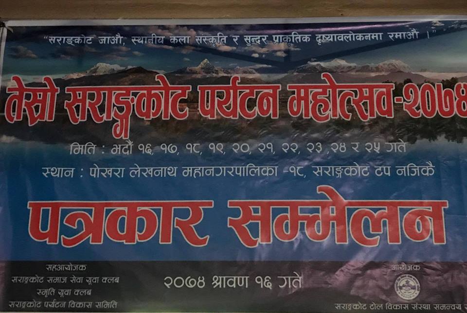 काठमाडौँ १६ साउन ।पर्यटनका लागि सुन्दर नगरी पोखरापुगेका संसार भरका नागरिकहरु सराङकोट नपुगीफर्कीए भने उनीहरु अधुरै रहन्छन । पोखरा र वरिपरिको हिमाली दृश्यलाई सुन्दर सेतुलेजोड्ने बिम्वहो सराङ्गकोट । बाहिरबाट सबैले चिनेको सराङ्गकोटको भित्रीअन्तर्य संसारभरी फैलाउनफेरी एक पटक सराङ्गकोट महोत्सवहुँदैछ । सराङ्गकोट संसार भरका पर्यटन पारखीलाई फेरी निम्तो गर्दैछ ।