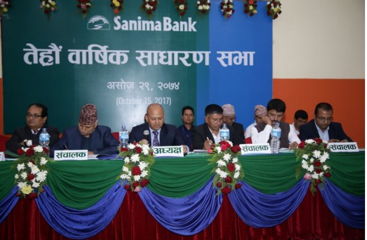 काठमाडौं। सानिमा बैंकको १३औं बार्षिक साधारणसभाले १६ प्रतिशत बोनस सेयर पारित गरेसँगै चुक्ता पूँजी ८ अर्ब पुगेको छ। नेपाल राष्ट्र बैंकले २०७४ असार मसान्तसम्मको नाफाबाट चुक्ता पूँजी ८ अर्ब रुपैयाँ पुर्याउनु पर्ने ब्यवस्था गरेको थियो। साधारणसभाले संस्थापक सेयरधनीका तर्फबाट तीन जना सञ्चालक चयन गरेको छ। सभाले विनयकुमार श्रेष्ठ, तुकप्रसाद पौडेल र शाम्वा लामालाई सञ्चालक निर्वाचित गरेको हो।बैंकले गत आर्थिक बर्ष एक अर्ब ३३ करोड रुपैयाँ नाफा गरेको थियो। बैंकको कुल निक्षेप करिव ५८ अर्ब र ऋण लगानी सवा ५१ अर्ब नाघेको छ।