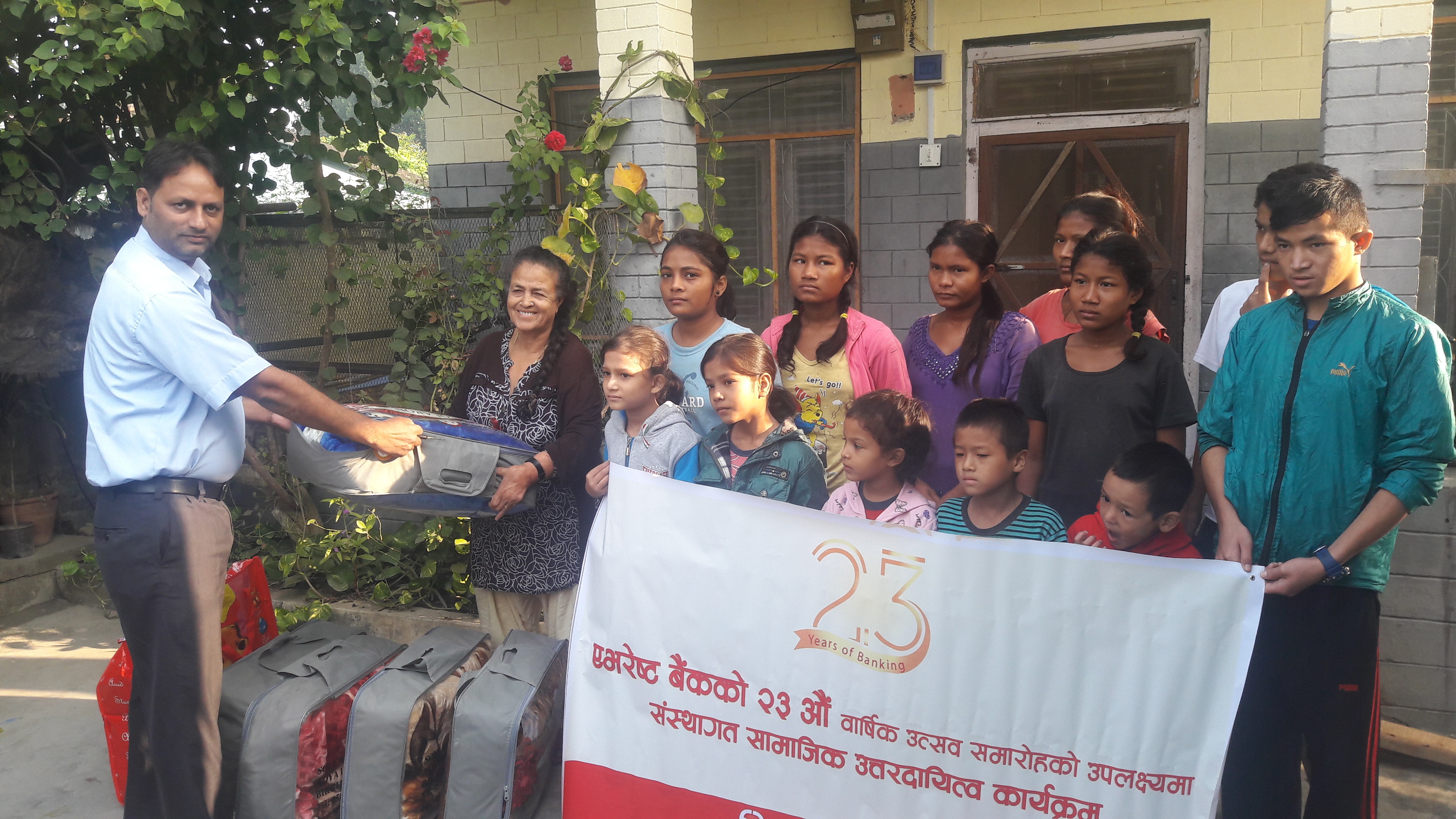 काठमाडौ । एभरेष्ट बैंकको २३औ वार्षिक उत्सव समारोहको उपलक्ष्यमा संस्थागत सामाजिक उत्तरदायित्व कार्यक्रम अन्र्तगत यस बैंकको शाखा कार्यालय धनगढीले अनाथ गृह, नयाँ जिवन मिसनलाई ब्ल्यांकेट तथा कम्मल वितरण गरेको छ । सो कार्यक्रममा एभरेष्ट बैंक धनगढीका शाखा प्रमुख यज्ञराज तिमिल्सिना र कर्जा विभाग प्रमुख हिमाल भट्टराईले सयुक्त रुपमा हस्तान्तरण गरे । एभरेष्ट बैंकको २३औ वार्षिक उत्सव समारोहको उपलक्ष्यमा सम्पुर्ण शाखाबाट संस्थागत सामाजिक उत्तरदायित्व कार्यक्रम अन्र्तगत बिभिन्न सहयोग गरी राखेको छ ।
