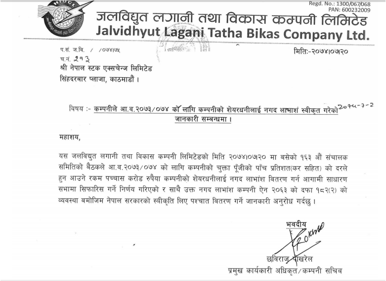 कम्पनीको उक्त प्रस्ताव नेपाल सरकारको स्वीकृति पश्चात र कम्पनीको आगामी साधारणसभाले पारित गरेपछि मात्र लगानीकर्तालाई वितरण गरिनेछ । कम्पनीले गत आर्थिक बर्षमो ४९ करोड ९ लाख ७८ हजार खुद नाफा गरेको थियो ।