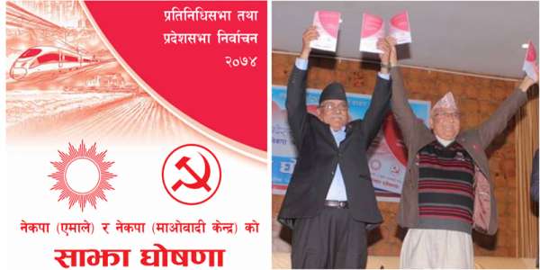 काठमाडौं । एमाले र माओवादीले आगामी ५ वर्षमा गर्ने काम समेटेर गठबन्धनको चुनावी घोषणापत्र सार्वजनिक गरेका छन् । घोषणापत्रमा ५ वर्ष भित्र पूर्वपञ्चिम राजमार्गको समानान्तर विद्युतीय रेलमार्ग देखि रसुवागढी काठमाडौं, पोखरा र लुम्बिनीलाई रेलमार्गले जोड्ने प्रण गरिएको छ ।