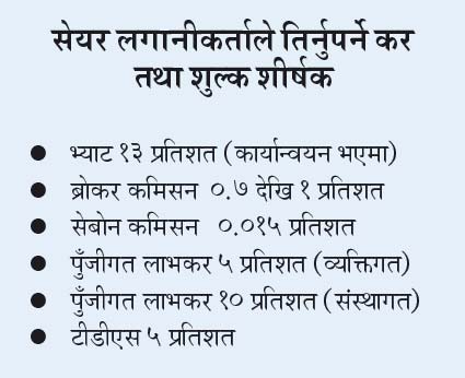 अहिले एउटा कारोबारमा लगानीकर्ताले ब्रोकर कमिसन ०।७ प्रतिशतदेखि एक प्रतिशतसम्म र सेबोन कमिसन ०.०१५ प्रतिशत तिर्नुपर्छ । यसबाहेक नाफामा बिक्री गर्दा व्यक्तिले पाँच प्रतिशत र संस्थाले १० प्रतिशत पुँजीगत लाभकर बापत थप शुल्क तिर्नुपर्छ । लाभांशमा टीडीएस समेत लाग्ने व्यवस्था छ ।