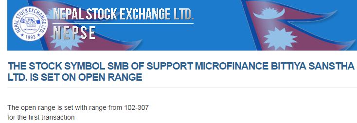 काठमाडौं। सपोर्ट माइक्रोफाइनान्स वित्तीय संस्थाको साधारण शेयरको कारोबार खुल्ला भएको छ । कम्पनीलाई पहिलो शेयर कारोबारको लागि नेपाल स्टक एक्सचेञ्जले १ सय २ रुपैयाँदेखि ३ सय ७ रुपैयाँ सम्मको मूल्य रेञ्ज दिएको छ ।