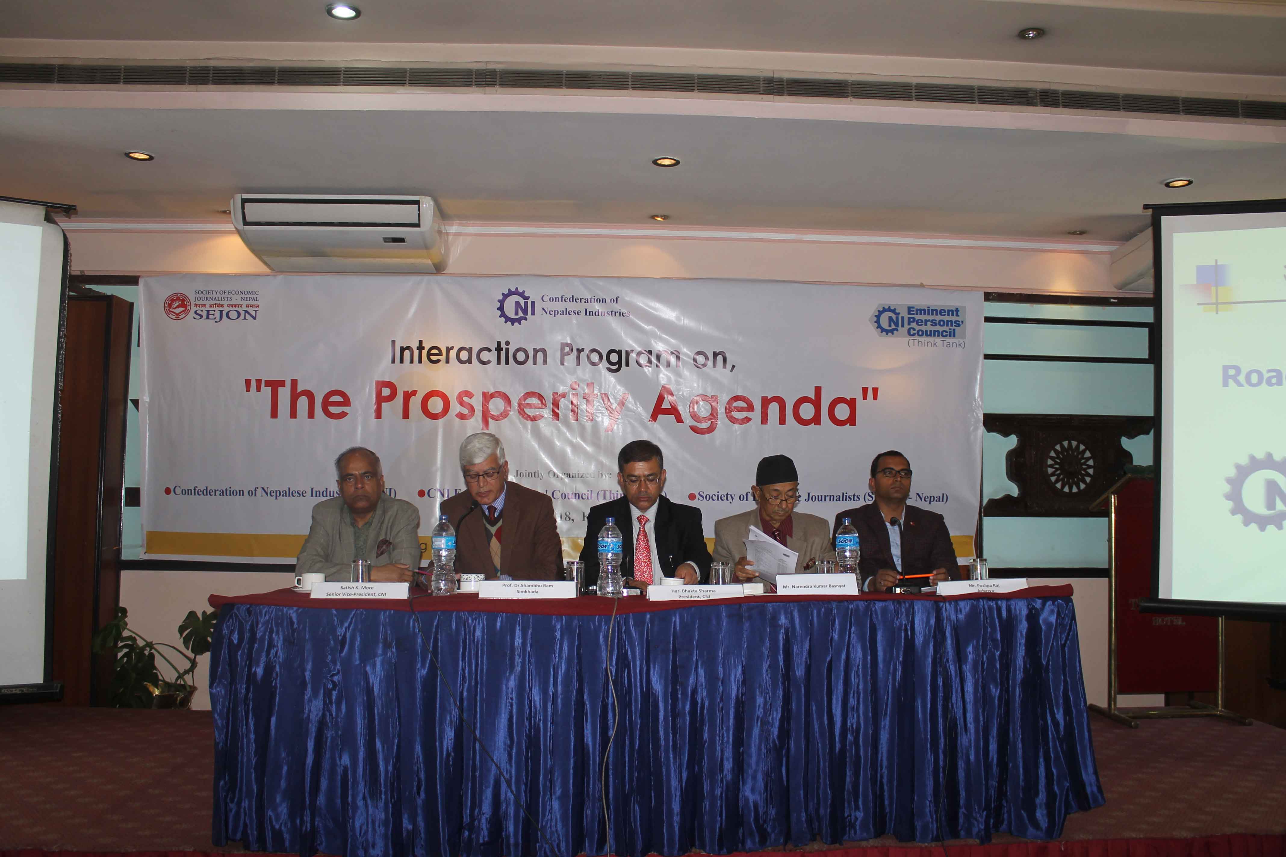 प्रा किशोर थापाले प्रजातान्त्रिक संस्था कमजोर हँुदै गएको, उद्योग खोल्न गाह्रो भएको, राजनीतिक नेतृत्वमा इच्छाशक्ति कमजोर भएको तथा बन्द– हड्ताल– चक्काजामले समृद्धिमा अप्ठेरो परेको बताउनुभयो । पूर्वसचिव पुरुषोत्तम ओझाले व्यापार घाटा कम गर्न कृषि, जलस्रोत, पर्यटन तथा पशुपालन क्षेत्रमा लगानी वृद्धि गर्नुपर्ने सुझाव दिनुभयो ।