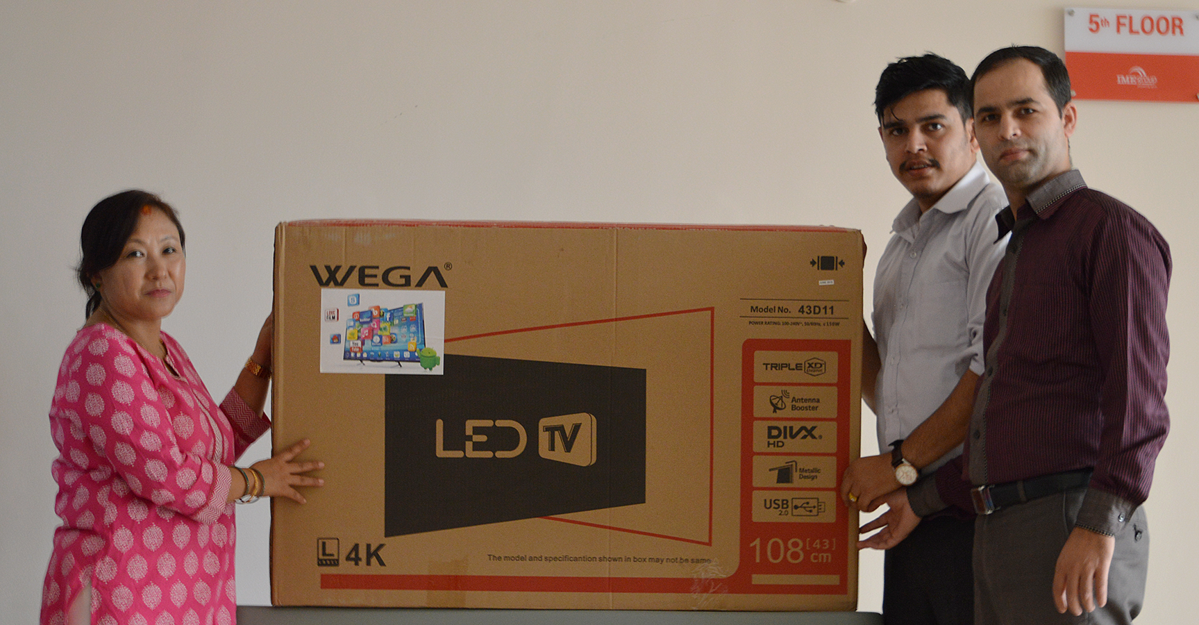 नयाँ वर्षको बहार आइएमई गर्दा उपहारै उपहार शिर्षकको ब्यापार प्रवर्द्धनात्मक कार्यक्रम अन्तर्गत आइएमई भाग्यशाली विजेता रेणुका लिम्बु ४३ इन्चको टेलिभिजन ग्रहण गर्दै ।