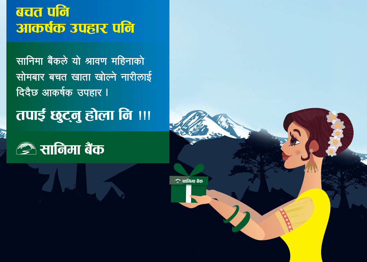 काठमाडौं । सानिमा बंैकले श्रावण महिनाको हरेक सोमबार बचत खाता खोल्ने महिला ग्राहकहरुलाई बिषेश उपहार दिने योजना ल्याएको छ । यो योजना अन्र्तगत सानिमा बंैकको मुख्य कार्यालय नक्साल लगायत देशै भरीका ७३ शाखाहरुबाट महिला ग्राहकहरुलाई बिषेश उपहार प्रदान गरिने बैंकले जनाएको छ ।