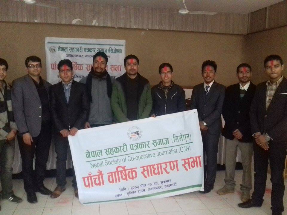 काठमाडाैं । नेपाल सहकारी पत्रकार समाज (सिजेएन) काे ५अाैं साधारणसभाले पुन: डिल्ली प्रसाद सापकाेटाकाे अध्यक्षतामा नयाँ कार्यसमिति चयन गरेकाे छ ।साधारणसभाले पुरानै कार्यसमितिलाइ सर्वसम्वत रुपमा चयन गरेकाे छ भने दुइ सदस्यमा नयाँ अनुहार रहेका छन् । नव निर्वाचित उपाध्यक्षमा राजेश खनाल (काठमाडौं पाेष्ट), सचिवमा खिला दाहाल (वर्तमान सहकारी मासिक), सहसचिवमा तुलसीराम सुवेदी (हरेकपल), काेषाध्यक्षमा काजी श्रेष्ठ (सहकारीखबर डटकम) रहेका छन् । त्यस्तै सदस्यहरुमा ज्ञानेन्द्र पाैडेल (हिमालयन टेलिभिजन ) र कृष्ण प्रसाद न्याैपाने (इमेज एफएम) रहेकाे छन् ।